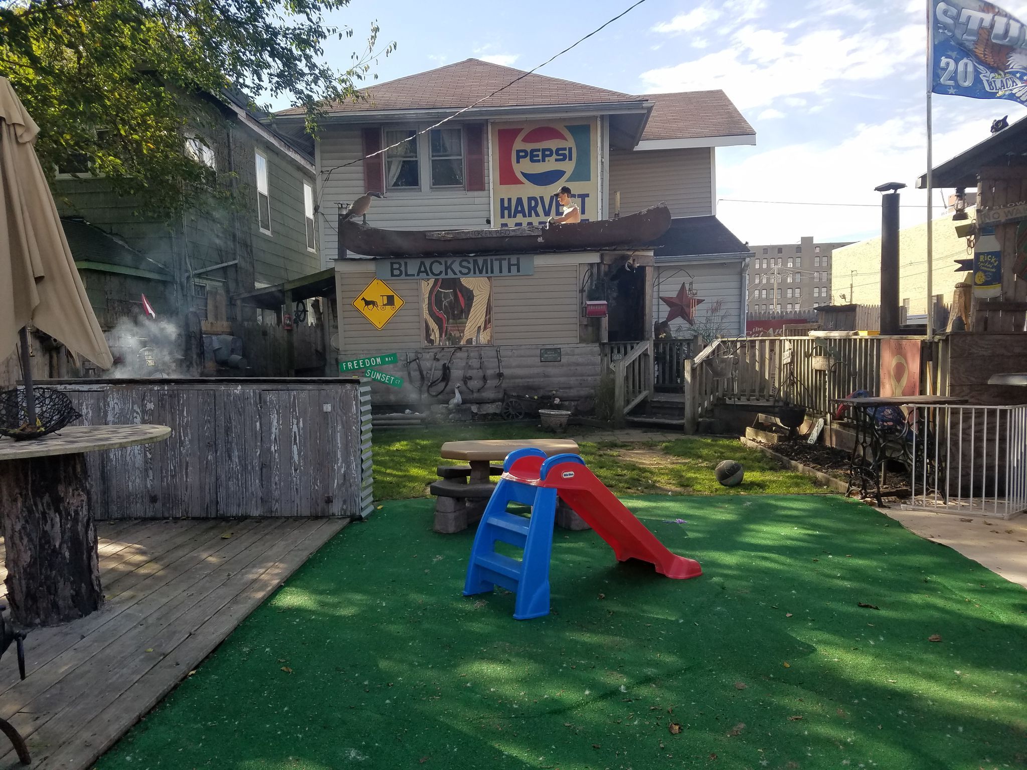 Our backyard has a full-size privacy fence with a fire pit, tables, chairs, grill and space for mandatory house meetings held every Sunday night!